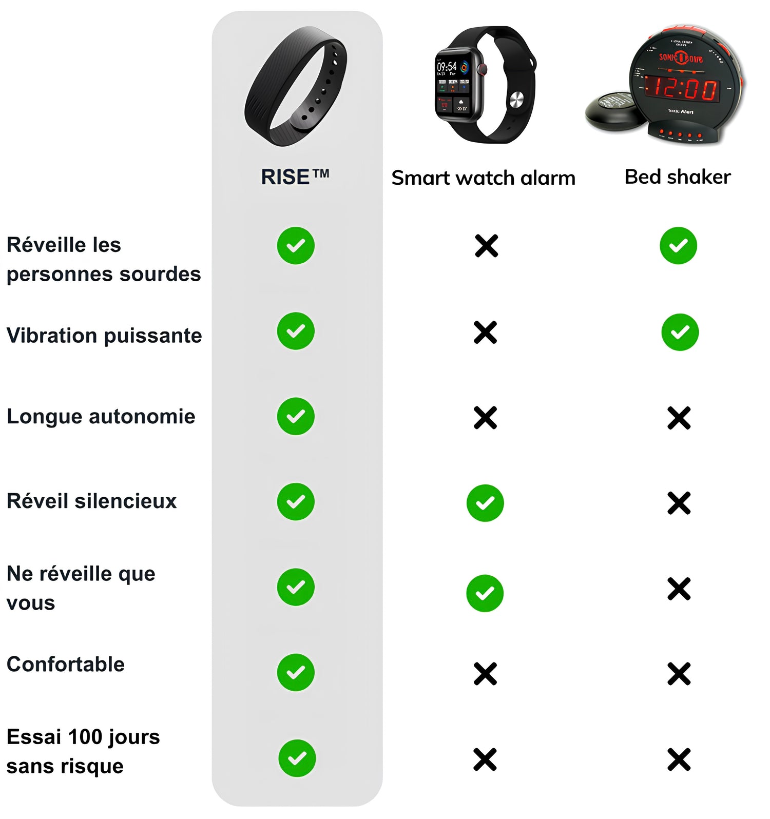 RISE™ utilise un système de réveil progressif : la vibration commence doucement, puis augmente automatiquement jusqu’à un niveau suffisamment fort pour réveiller même les dormeurs les plus difficiles. Ce fonctionnement garantit un réveil agréable, naturel et surtout fiable, sans réglages complexes.